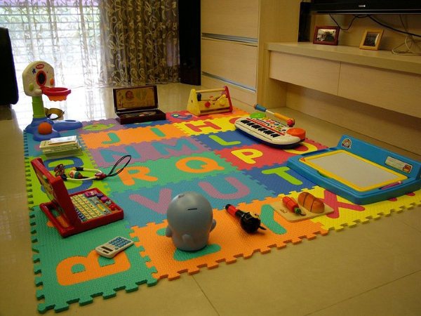 地墊上擺有Playskool天才小推車(二合一學步車+嬰兒木馬)跟小叔太太借我們的螃蟹車
