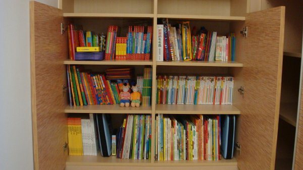 幫他買的所有中英文教材與繪本(共兩百多本)都整理到書房裡他專屬的書櫃區