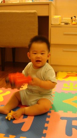 往前爬的次數少之又少 也不喜歡別人要求他做拍手或揮手的動作